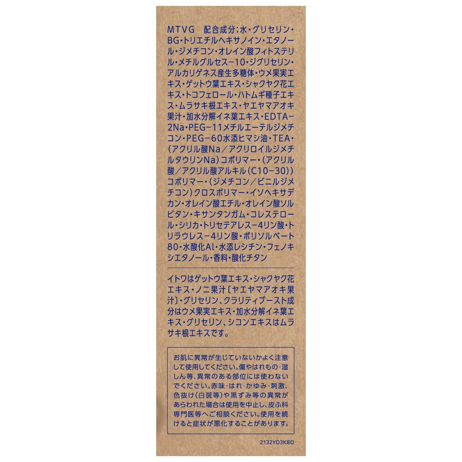 イトワはゲットウ葉エキス、シャクヤク花エキス、ノニ果汁 (ヤエヤマアオキ果汁) 、グリセリン、クラリティブースト成分はウメ果実エキス、加水分解イネ葉エキス、グリセリン、シコンエキスはムラサキ根エキスです。